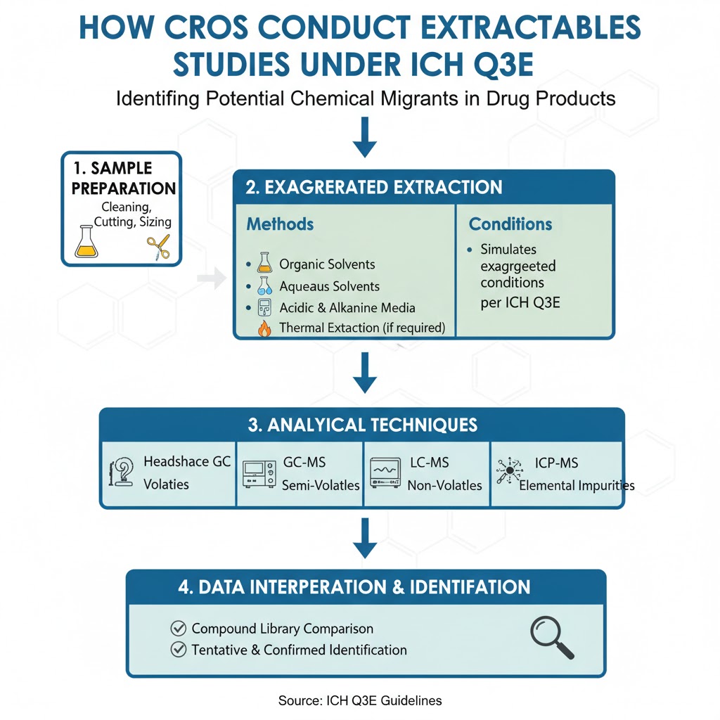 The ICH Q3E Extractables and Leachables (E&L) study requirements outline a unified regulatory expectation for evaluating chemical migrants from packaging and delivery systems. In a CRO environment, conducting these studies requires structured workflows, validated analytical tools, and deep regulatory experience. This article explains exactly how a CRO performs E&L studies according to the new guideline.