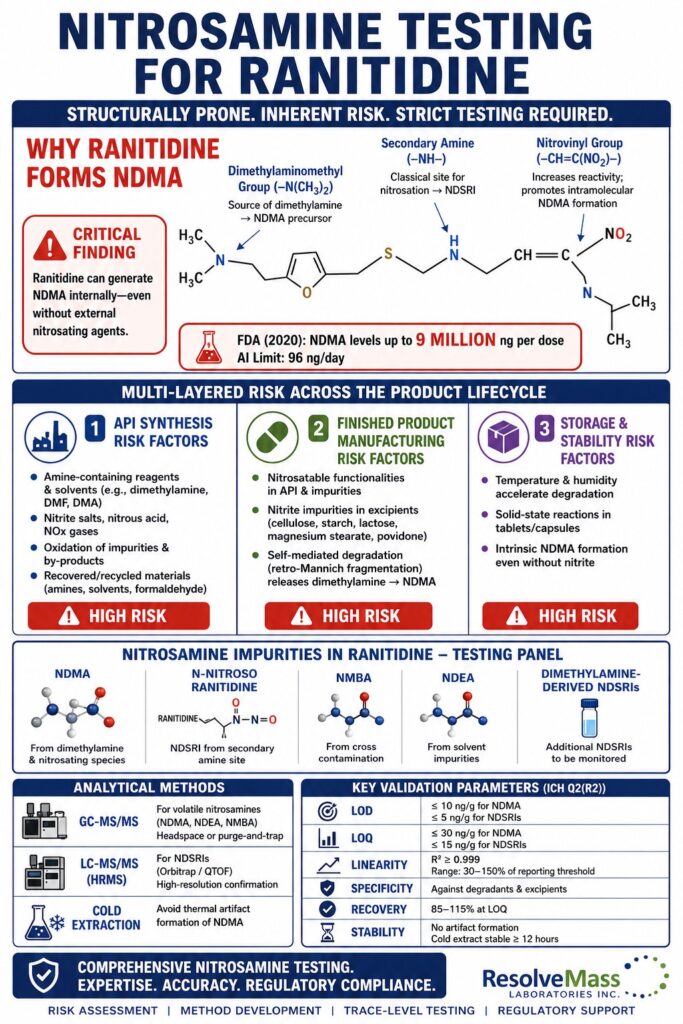 • ResolveMass Laboratories provides complete Nitrosamine Testing for Ranitidine. Services include risk assessment, method development, and validated testing. Both API and finished dosage forms are supported. Regulatory documentation assistance is also available.