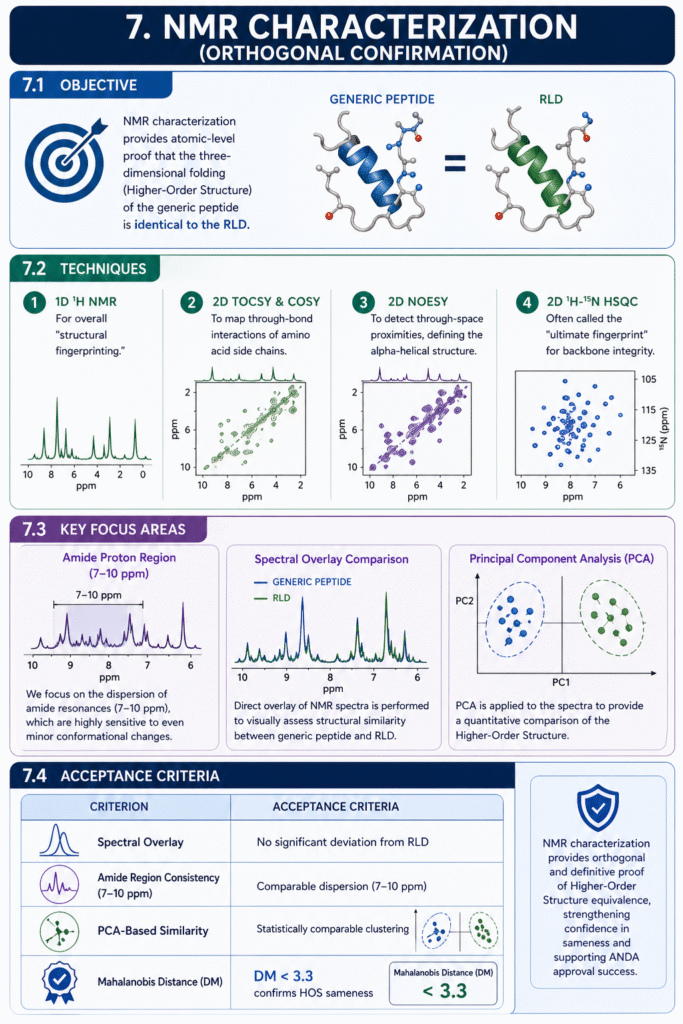 - Higher-Order Structure (HOS): Multidimensional 1D and 2D NMR (HSQC, TOCSY, NOESY) provide the “structural fingerprint” required to statistically prove conformational equivalence to the RLD.